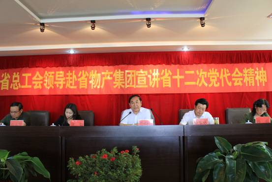 7月2日下午,省總工會(huì)巡視員、經(jīng)費(fèi)審查委員會(huì)主任劉西昆、經(jīng)審辦蒲勤主任、女工部韓梅部長(zhǎng)、重工機(jī)械輕紡工會(huì)白立賢副主席一行4人來(lái)物產(chǎn)集團(tuán)宣講省十二次黨代會(huì)精神。集團(tuán)黨委書(shū)記、工會(huì)主席白家林同志主持宣講報(bào)告會(huì),集團(tuán)兩級(jí)工會(huì)主席、委員40余人參加宣講報(bào)告會(huì)。